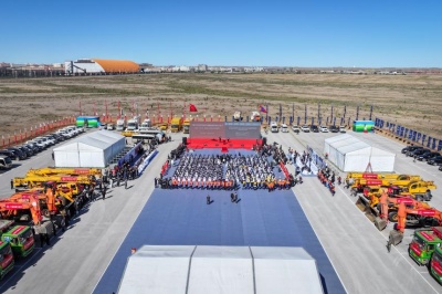 2025年5月14日拍摄的中蒙甘其毛都至嘎顺苏海图铁路建设开工仪式(无人机照片)。新华社发