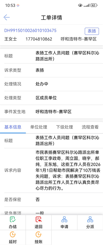 当民警将完好无损的行李交到王女士手中时,王女士激动不已,紧紧握住民警的手反复道谢:“太感谢你们了!没想到这么快就能找回来,你们真是人民的好警察!”为表达谢意,王女士当场拨打12345市民服务热线对民警提出表扬。
