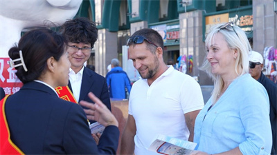 工商银行内蒙古分行工银“乌兰牧骑”小分队走向街头,向外籍人员宣传个人外汇业务。