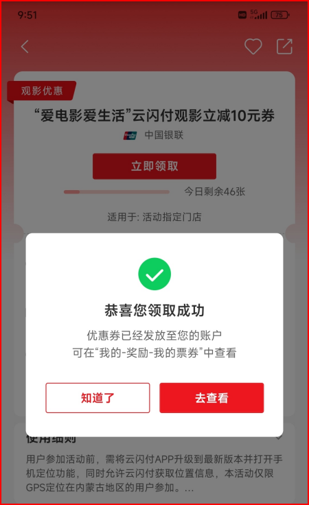 活动期间,初定每日上午9点发放优惠券。消费者可登陆“云闪付”,在首页点击“观影优惠 爱电影爱生活”或直接搜索“爱电影爱生活”,即可领取观影立减10元券。领券后,消费者在云闪付APP内搜索“猫眼”小程序,购票后线上支付直接立减10元。每个用户每周可领取、使用1张优惠券,每月可使用2张优惠券。