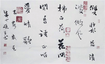 在创作书法作品时,怎样表现出在公园里那种欢唱的心情,悠然自得和闲情逸致的情感是创作书法作品时考虑的问题。在章法安排上寻求一种空灵清新的味道,字与字之间,行与行之间,都留有很大的空白,整片除了微风二字连接以外,其他的字全部没有照应关系。作品完成以后,到这个时候,书写手段把要表达的趣味已经全部展示出来。但是,整体感觉松散,不紧凑,考虑再三,多盖几方印章来补充不足之处,印章大小疏密的点缀增加了整体的欣赏效果。