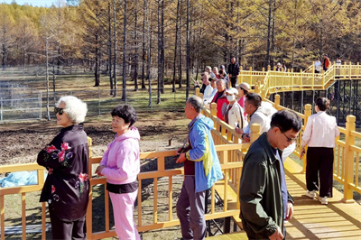 游客们沿着步道欣赏林区景观。(来源:阿荣旗融媒体中心)