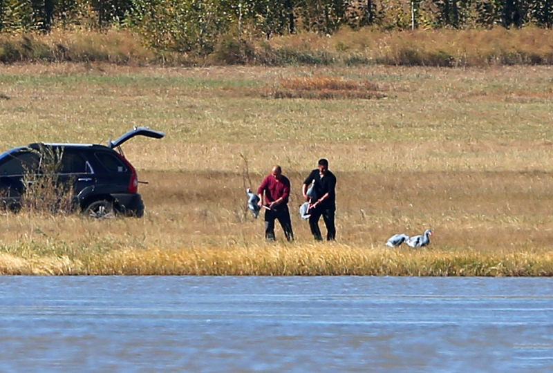 我用长焦镜头对准调焦,基本看清了:他们是往浅水泥土中安插鸿雁的标本,一共安插了5个鸿雁标本,之后又在标本附近播撒一些东西。