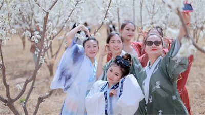 梨树下,游客们身着汉服打卡拍照。(摄影:刘九维)