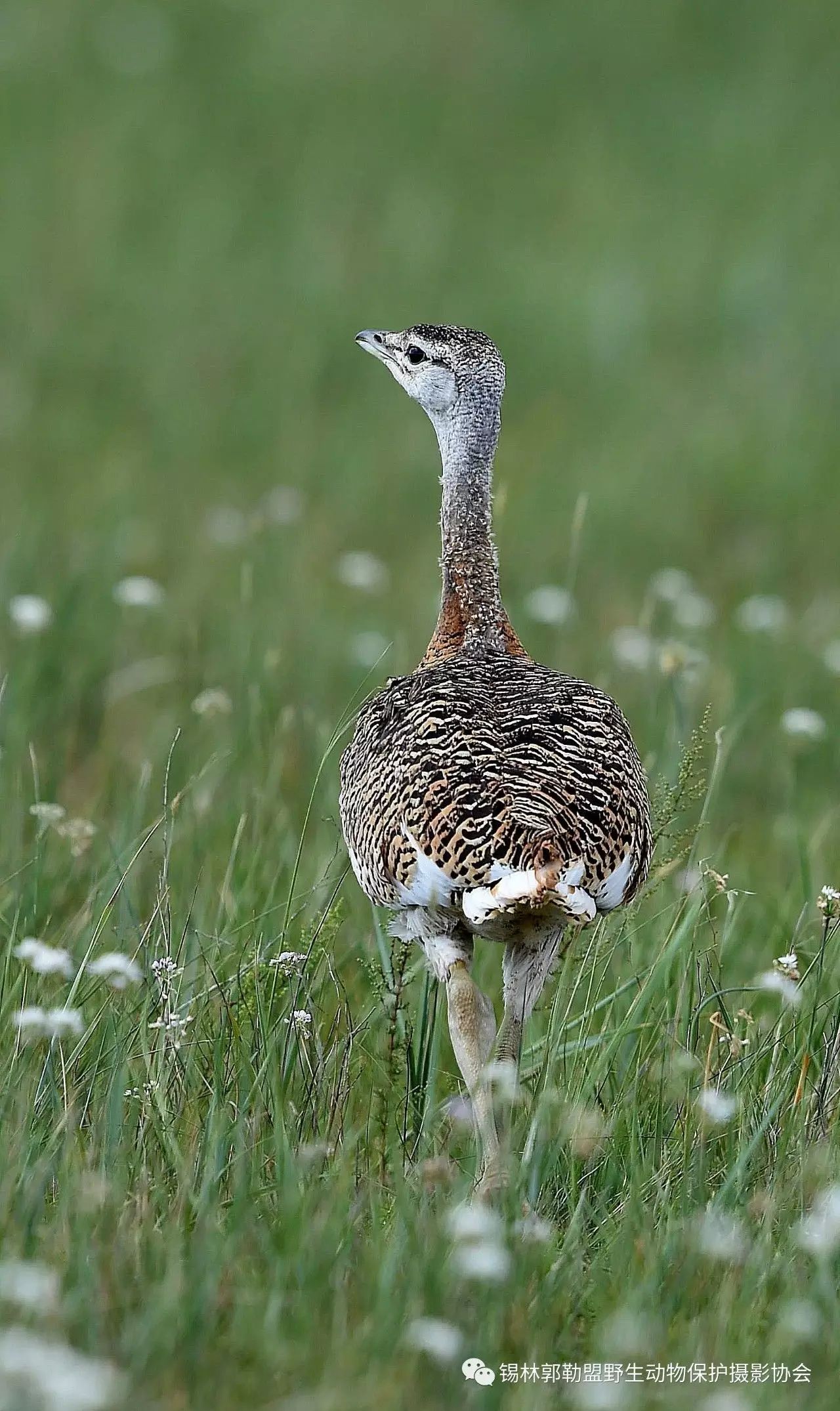 大鸨(学名:Otis tarda)是鹤形目鸨科的大型地栖鸟类。翅长超过400毫米。嘴短,头长、基部宽大于高。翅大而圆,第3枚初级飞羽最长。无冠羽或皱领,雄鸟在喉部两侧有刚毛状的须状羽,其上身有少量的羽瓣。跗蹠等于翅长的1/4。雄鸟的头、颈及前胸灰色,其余下体栗棕色,密布宽阔的黑色横斑。下体灰白色,颏下有细长向两侧伸出的须状纤羽。雌雄鸟的两翅覆羽均为白色,在翅上形成大的白斑,飞翔时十分明显。